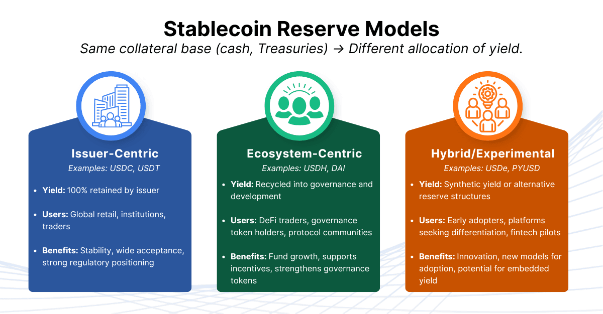 Issuer-centric models (USDC, USDT): yield concentrated at the corporate level, prioritising regulatory caution and balance sheet strength.
