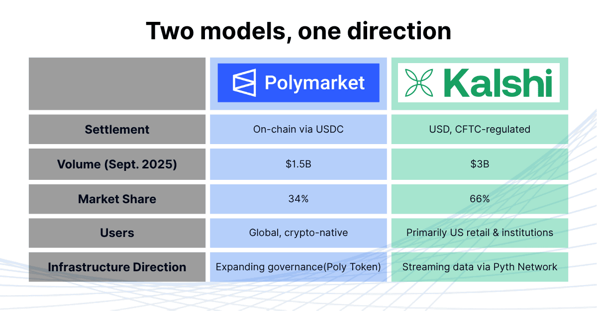 Polymarket and Kalshi are travelling different routes toward the same destination. One starts with decentralisation seeking regulatory trust; the other starts with regulation seeking decentralised reach. Both are converging on an industry where prediction data itself is a financial product, and blockchain is the only infrastructure capable of making that product reliable, composable, and global.