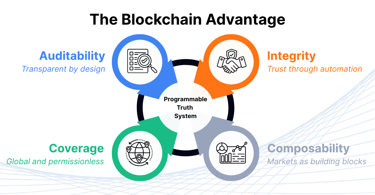 Only blockchain meets all four requirements simultaneously. It turns prediction markets from speculative experiments into programmable truth systems: a data layer where outcomes are both priced and provable.