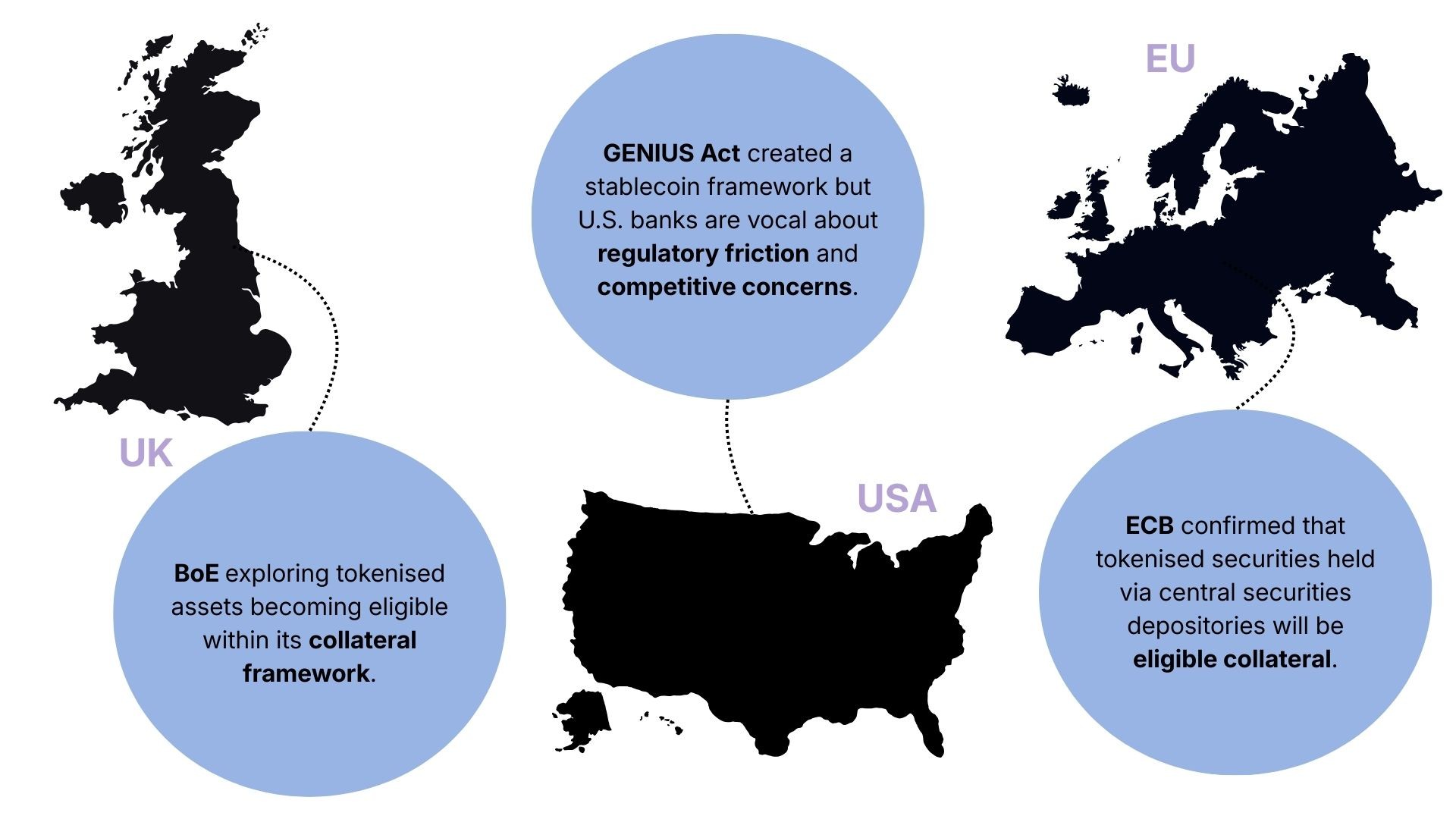 In Europe, the ECB has confirmed that tokenised securities held via central securities depositories will be eligible collateral for Eurosystem credit operations from March 2026 .