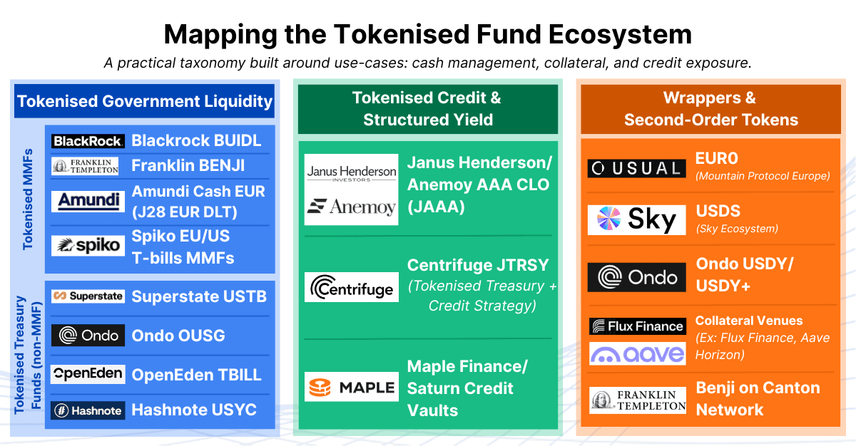 Products like JAAA anchor the “credit” segment of the tokenised fund landscape. They behave differently from tokenised cash instruments, and their risks and incentives ripple through the market in different ways.